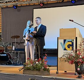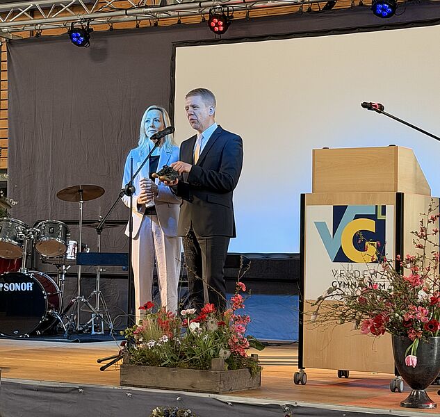In den Redebeiträgen wurde der Weg der Schülerinnen und Schüler als ein Prozess des Wachsens beschrieben – ein Hinausgehen über eigene Grenzen, ein Lernen aus Erfolgen wie aus Rückschlägen. Die vergangenen Jahre hätten gezeigt, dass Leistung nicht Perfektion bedeute, sondern die Bereitschaft, sich immer wieder neuen Aufgaben zu stellen. Besonders eindrucksvoll war das Bild der „kleinen Schuhe“, das Herr Dr. Dr. Königstein und Frau Genschow sinnbildlich für die ersten Schritte im Leben zur Schau stellten. Es erinnerte daran, dass Entwicklung Zeit braucht, dass Unsicherheiten dazugehören und dass jeder Fortschritt mit Mut verbunden ist. Gleichzeitig wurde deutlich: Mit dem heutigen Tag beginnt ein neuer Abschnitt, in dem die Absolventinnen und Absolventen ihren Weg eigenständig gehen müssen.