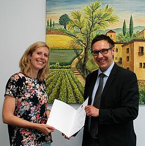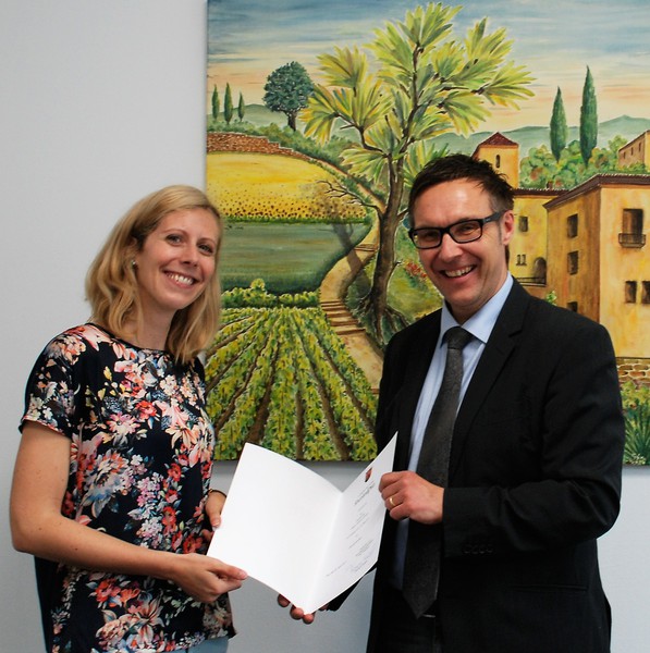 Frau Helena Schlarb, die seit 2012 am VGL Sozialkunde, Sport und Musik unterrichtet, wurde zur Oberstudienrätin ernannt. Nach ihrem Studium von Sport und Politikwissenschaft an der Johannes-Gutenberg Universität in Mainz und ihrem Referendariat am Angela-Merici-Gymnasium in Trier startet Helena Schlarb am Veldenz Gymnasium als fertig ausgebildete Lehrerin. Schnell erwarb sie das Vertrauen der Kinder und wurde zur Verbindungslehrerin gewählt.