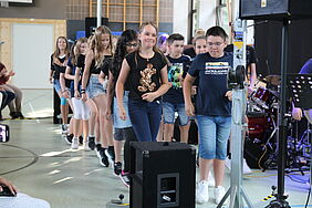 Der Abend, ganz der Musik gewidmet, startete um 18:00 Uhr mit einem gesanglichen Beitrag („Kommt ein Vogel geflogen“ – Mark Forster) der Klasse 5a, die vom Musik-Grundkurs der MSS12 begleitet wurde. Tänzerisch legte die Parallelklasse mit dem „Cupid Shuffle“ nach.