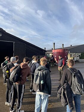 Zu Fuß machten wir uns am Morgen von der Schule aus auf den Weg und wurden nach einem kurzen Spaziergang von Herrn Steinhauer herzlich empfangen. Er führte uns zunächst durch den Rinderstall, in dem über hundert Masttiere gehalten werden, und erklärte anschaulich die Abläufe der Rindermast sowie die wirtschaftliche Bedeutung regionaler Viehhaltung. Anschließend zeigte er uns die betriebseigene, mittlerweile aus wirtschaftlichen Gründen stillgelegte Biogasanlage sowie die Grünschnittsammelstelle, die zur Energie- und Nährstoffrückgewinnung beiträgt.