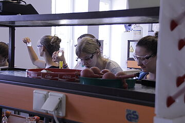 Nach einem kurzen Einfinden in den Zimmern, wanderten zwei Gruppen zum Meerfelder Maar. Dieser Marsch erstreckte sich über einen anspruchsvollen 2,5 km weiten Weg. Am Ufer angekommen, beluden wir das Boot mit den Materialien, die uns Herr Dawen brachte. Mit Herrn Brauer und dem Boot in der Mitte des Sees angelangt, begann die erste Gruppe mit der Probenentnahme. Es wurde die O2-Sättigung, die Temperatur, der pH-Wert, die Sichttiefe und die Leitfähigkeit gemessen sowie auch Wasserproben und Sedimentproben mit ins Labor genommen. Während die erste Gruppe zurück ins Labor lief, ging die zweite Gruppe aufs Boot und führte entsprechende Messungen durch. Im Labor fing die erste Gruppe an, die Wasserproben auf Ammonium zu untersuchen. Die anderen zwei Gruppen mikroskopierten in der Zeit in dem Labor und fingen mit den Zeichnungen des Phytoplanktons und des Zooplanktons an. Abends bestellten wir Pizza und spielten in einer gemütlichen Runde mehrere Spiele.