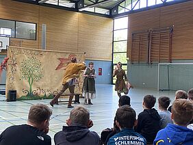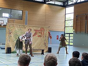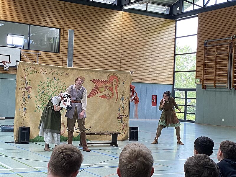 Die erste Aufführung des Tages war speziell für die Klassenstufen 5 bis 7 konzipiert. Das Stück umfasste die drei irischen Märchen: „Goldtree and Silvertree“, „Finn McCoul“, sowie „Hudden and Dudden and Donald O’ Neary“. Diese Geschichten wurden lebhaft und mitreißend dargestellt, sodass selbst unsere jüngsten Schülerinnen und Schüler der 5. Klasse den rein englischsprachigen Vorführungen problemlos folgen konnten. Die hervorragende schauspielerische Leistung der Darsteller sorgte dafür, dass die Märchen zum Leben erweckt wurden und die Zuschauer in ihren Bann zogen.