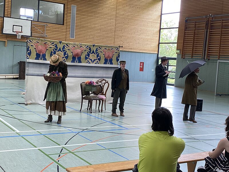 Für die älteren Schülerinnen und Schüler der Klassen 10 bis 12 wurde eine 90-minütige Aufführung des Klassikers „Pygmalion“ von George Bernard Shaw gezeigt. Diese Komödie erzählt die Geschichte von Professor Henry Higgins, einem arroganten Sprachwissenschaftler, der wettet, dass er die mittelose Blumenverkäuferin Eliza Doolittle zu einer Herzogin machen kann, indem er ihr beibringt, mit dem Akzent der feinen Londoner Gesellschaft zu sprechen. Höhepunkt der Geschichte ist eine Botschafter-Party, auf der Higgins Eliza erfolgreich als Herzogin ausgibt. Doch aufgrund seiner selbstherrlichen und gefühllosen Art behandelt Higgins Eliza wie eine Dienstmagd, was dazu führt, dass sie ihn schließlich verlässt. Ähnlich wie der Pygmalion des Ovid, der sein lebloses Kunstwerk liebt, liebt Higgins nicht die Person, nicht Eliza selbst, sondern nur das sprachliche Kunstwerk, das er geschaffen hat.