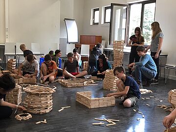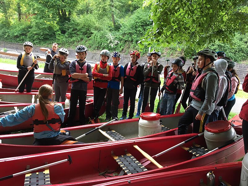 Am zweiten Tag ging es schon für unsere Klasse 7b um 7.30 Uhr zum Frühstück und danach direkt mit dem Fahrrad zum Bahnhof Wolfstein-Roßbach, um mit dem Zug nach Kreimbach-Kaulbach zum Kanufahren zu gelangen. Nach einer kurzen Einweisung zum richtigen Paddeln von den Betreuern Olli und Leonie ging es auch schon aufs Wasser: Ein Erlebnis pur, denn es war schwierig, das Gleichgewicht zu halten und richtig zu paddeln, um voranzukommen, sich nicht zu drehen und auch nicht sich und andere zu gefährden. Aber es machte viel Spaß! Plötzlich fiel ein Kanu mit drei Schülern ins Wasser, aber ein paar Minuten später ging es für alle wieder weiter. In Rutsweiler mit den Kanus angekommen, liefen wir den knappen Kilometer zum Roßbacher Bahnhof, an dem auch unsere Fahrräder standen, und fuhren wieder zurück zur Jugendherberge. Nach einem guten Mittagessen in der Jugendherberge trafen wir uns am Nachmittag mit Betreuer Markus im Aufenthaltsraum, der über 8000 Holzbausteine dabei hatte, aus denen wir eine große Stadt bauten. Wichtig dabei war es, jedes Gebäude miteinander durch ein Straßennetz zu verbinden.