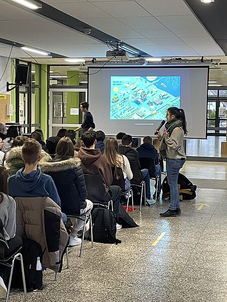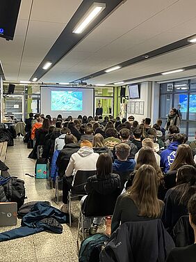 Die beiden präsentierten den Klassenstufen 8-13 Klimaziele, zukunftsorientierte Lösungsvorschläge zum Klimawandel sowie ein weitreichendes Bild des zukünftigen Lebens. Außerdem anwesend waren die Vertretung des Landtags Herr Gruber und der Vorstand der Volksbank Lauterecken Herr Walter.