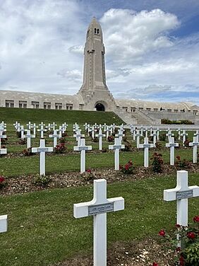 Nach einer Stärkung ging es weiter zu einem Soldatenfriedhof, auf dem unzählige weiße Kreuze stehen, die sich endlos über das Feld erstrecken und bei uns allen einen bleibenden Eindruck hinterließen. Jedes Kreuz steht für einen gefallenen Soldaten, und die schiere Anzahl der Gräber machte uns die ganze Tragweite des Krieges auf erschreckende Weise bewusst. Dieser Friedhof ist Teil des Beinhauses von Douaumont, einer nationalen Grabstätte für die Gebeine von Gefallenen, die nach der Schlacht nicht identifiziert werden konnten. Im Beinhaus selbst, das wir anschließend besichtigten, werden die Gebeine von über 130.000 Soldaten aufbewahrt. Dieser Ort ist der Stille und des Gedenkens gewidmet und berührte uns tief.
