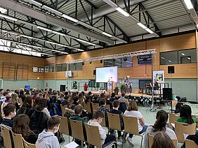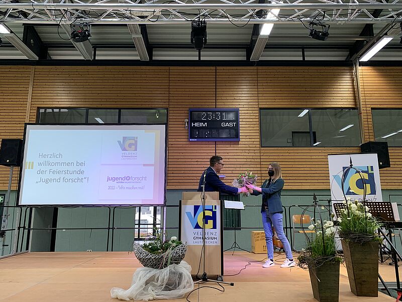 Schulleiter Stefan Weber zeigte sich in seinen Schlussworten von dem Ideenreichtum und dem Einsatz der JungforscherInnen begeistert und überreichte ihnen freudig ihre wohlverdienten Preise und Urkunden. Besonders betonte er dabei noch einmal den nachhaltigen sowie regionalen Aspekt, der vielen Forschungsprojekten zugrunde lag, da gerade die Erforschung der Wirkung von Steinstaub auf den Boden auf eine Anfrage des Steinbruchs Jung und des landwirtschaftlichen Betriebs der Familie Steinhauer-Theis zurückzuführen sei, mit welchen man sich vorab bzgl. einer möglichen Verwertung des Abfallprodukts Steinstaub ausgetauscht habe. Die Umsetzung dieser Idee im Rahmen der Projekte sei dabei überaus geglückt und werde – so die Hoffnung der ganzen Schulgemeinschaft – hoffentlich auch für einen Erfolg beim Landeswettbewerb sorgen.