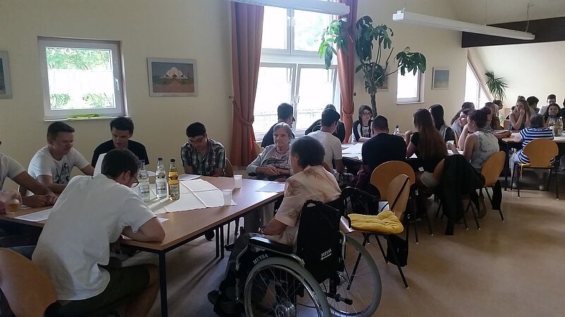 Begrüßt wurden wir von Johann Becker, dem Leiter des Heimes. Anschließend wurden wir in vier Gruppen aufgeteilt und erfuhren mehr über den Alltag der Bewohner, über die Ausbildung zum Pfleger/ zur Pflegerin, über das Haus an sich (Hausführung) und über das Leben, das die Bewohner des Heimes in früheren Zeiten geführt hatten. Wir versetzten uns in die Lage eines Bewohners, indem wir uns gegenseitig Essen und Trinken zuführten (uns fütterten), indem wir das „Liften“ nachstellten und einen Transport per Rollstuhl simulierten.