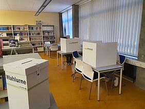 Wenn es darum geht, seine eigene Stimme abzugeben, werden Fragen wie „wie wird gewählt?“, „wen kann ich wählen?“ und „wie geht es nach der Wahl weiter?“ wichtiger und fördern eine intensive Auseinandersetzung mit dem Ablauf der Wahlen und den Parteien, die zur Wahl stehen. Die Schüler und Schülerinnen haben sich mit dem Wahlsystem und mit Hilfe selbst erarbeiteter Plakate zu ausgesuchten Themen verschiedene Parteipositionen angeschaut und verglichen. Federführend hat die 11. Jahrgangsstufe Plakate erstellt, die allen SchülerInnen bei einem Besuch im „Wahlinformationsraum“ einen ersten Eindruck vermittelten, welche Inhalte und Parteien sie am ehesten überzeugen. Der Wahlvorgang selbst lief genauso ab wie bei der „richtigen“ Wahl am Sonntag. Einige Woche bevor es ans Wählen ging, bekamen alle eine von den Schülerinnen und Schüler des Wahlteams erstellte Wahlberechtigung, welche am Wahltag im Wahllokal vorgelegt werden musste. Am eigentlichen Wahltag kamen die Klassen oder Kurse nacheinander in das „Wahllokal”. Danach ging es mit dem Stimmzettel in eine der vier Wahlkabinen. Dabei stand es jedem frei, ob er wählen möchte oder nicht. Die Stimmzettel wurden dann in der versiegelten Wahlurne gesammelt. Nachdem das Wahllokal geschlossen wurde, haben alle WahlhelferInnen zusammen mit Frau Halter die Stimmen ausgezählt.