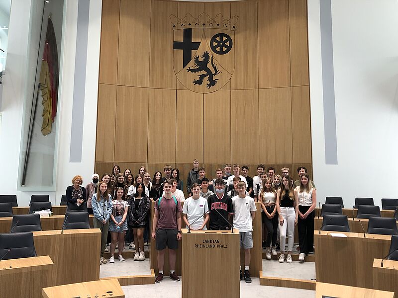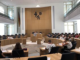 Nach Betreten des Gebäudes wurden wir sofort zum Plenarsaal gebracht, wo wir uns selbstständig einen Platz aussuchen durften. In einer kurzen Fragerunde mit dem Mitarbeiter wurde unser Wissen über die Landespolitik aufgefrischt. Danach warfen wir einen Blick auf den Ablauf einer Fraktionssitzung, welche jedem von uns in Form eines Ablaufplans vorlag, und wurden in die drei Fraktionen blau, lila und orange eingeteilt, sodass wir nun in die Rolle von Landtagsabgeordneten schlüpften. Kurz darauf starteten wir dann mit unserer jeweiligen Fraktionssitzung, bei der wir zunächst Personalentscheidungen trafen. Dann erfolgte die zweite 45-minütige Fraktionssitzung, in der wir uns genauer mit dem Thema „PKW-Führerschein ab 1 6?" auseinandersetzten und dabei Argumente für verschiedene Sachbereiche hinsichtlich der uns zugeteilten Position erarbeiteten. Danach startete die Plenarsitzung, wo anfangs die Fraktionsvorsitzenden der verschiedenen Fraktionen die zuvor erarbeiteten Anträge vorstellten. Anschließend fand die erste Debatte statt, bei der die einzelnen Fraktionen gegeneinander argumentierten und ihren Standpunkt darlegten. Nach einer folgenden 15-minütigen Sitzungsunterbrechung, bei der Absprachen zwischen den Fraktionen erfolgten, wurde die Debatte fortgesetzt. In den letzten fümf Minuten wurden dann über die anfänglichen Anträge abgestimmt.