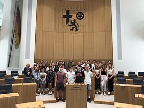 Als wir dort ankamen, wurden wir sofort von einem Mitarbeiter in Empfang genommen, welcher uns zunächst die historische Geschichte des Landtaggebäudes näherbrachte. Hierbei erfuhren wir beispielsweise, dass das Landtagsgebäude zunächst als Residenz des Königs vorgesehen war sowie dass vor dem Gebäude der erste Demokratieversuch in Deutschland stattfand.