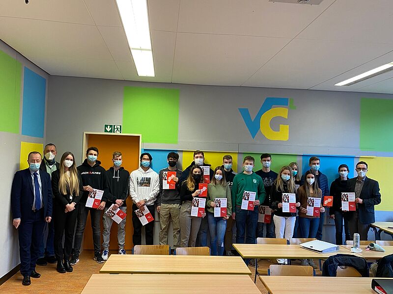 Mit vier Teams unter den ersten Plätzen war das VGL erfolgreichste Schule beim Planspiel Börse. Als besondere Anerkennung für diese Leistung überreichten Roland Sander und Carolin Selzer von der Kreisparkasse Kusel dem VGL den Schulpreis, er ist mit 250€ dotiert. Die Schülerinnen und Schüler der 11. Jahrgangsstufe werden in den kommenden Wochen Vorschläge einreichen, wie das Geld gut für die Schulgemeinschaft angelegt ist.