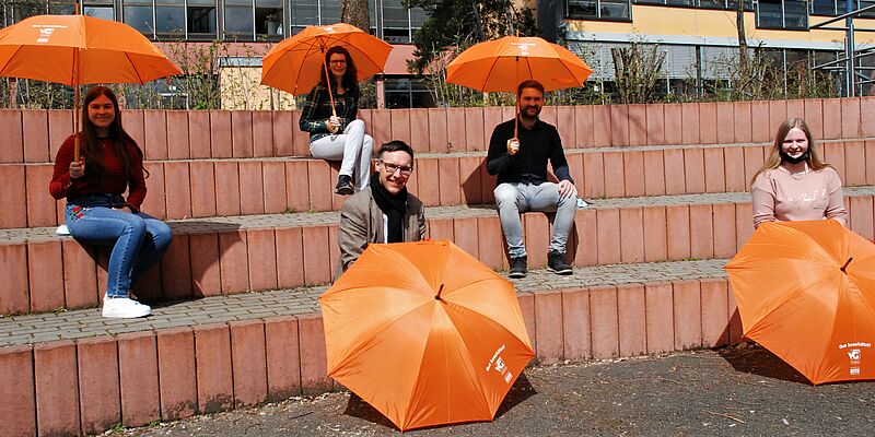 Unser Bild zeigt die feierliche Übergabe der Regenschirme durch die Firma BIto (vertreten durch Kevin Stannik-Bildmitte) an die Schülervertretung des Veldenz-Gymnasiums (vertreten durch Hanna Knecht, Yvonne Halter und Malin Drumm -von links nach rechts) und Schulleiter Stefan Weber (Im Vordergrund)