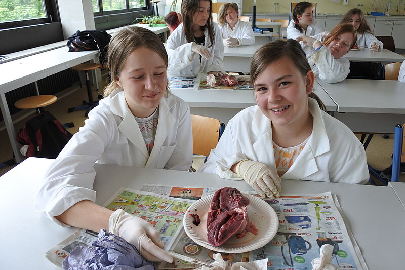 Nach den Grundlagen ging es dann aber endlich ans “Schnippeln“. Als allererstes haben wir geklärt, wie wir das Schweineherz am besten aufschneiden. Dafür zeigte uns Frau Fahlberg viele Bilder und besprach mit uns das Wichtigste. Danach bekamen wir immer zu zweit ein Herz und machten uns an die Arbeit. Viele von uns, die gedacht haben, dass sie sich das niemals trauen würden, haben gemerkt, dass das Präparieren eines Herzens gar nicht so schlimm ist. Wir konnten vieles sehen und entdecken, was wir zuvor nur von Bildern her kannten. So macht Biologie richtig Spass!