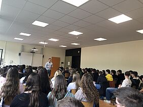Unsere Veranstaltung endet mit einem riesengroßen, begeisterten Applaus für Herrn Mieves und seinen Begleiter. Wir möchten uns ganz herzlich bei ihm bedanken. Der Tag war für uns alle sehr inspirierend gewesen und wird uns sicherlich noch lange im Gedächtnis bleiben. Ihr Besuch hat unsere Fragen nicht nur beantwortet, sondern uns auch neue Einblicke und Denkanstöße gegeben. Ein großes Dankeschön an alle, die uns diesen Austausch ermöglicht haben. Und vielen Dank an Herrn Mieves für Ihren Besuch, Ihre Offenheit und Ihre Zeit!