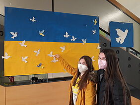 Diese Tauben wurden auf einer Plakatwand im Schulgebäude angebracht (unser Bild) und spiegeln Gedanken und Hoffnungen der Schülerinnen und Schüler: „Nie wieder Krieg“, „Hoffnung für die Menschen in der Ukraine“ und „Gott möge die Menschen in ihrer Not behüten“.