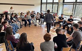 Der Dienstag stand ganz im Zeichen des gegenseitigen Kennenlernens sowie der inhaltlichen Arbeit. Nach weiteren Kennenlernspielen beschäftigten sich die Schülerinnen und Schüler in einem Quiz mit kulturellen Gemeinsamkeiten und Unterschieden („Typisch tschechisch – typisch deutsch?“). Anschließend begann die Projektarbeit in gemischten Gruppen. Thematisch setzten sich die Jugendlichen mit dem Zweiten Weltkrieg, der Bedeutung der Münchner Konferenz und ihren Folgen für Tschechien sowie mit der NS-Ideologie auseinander. Am Nachmittag erkundeten die Gruppen die Stadt Lauterecken mithilfe der App „Actionbound“, was für eine abwechslungsreiche und interaktive Auseinandersetzung mit der Region sorgte und das gemeinsame Miteinander weiter stärkte.
