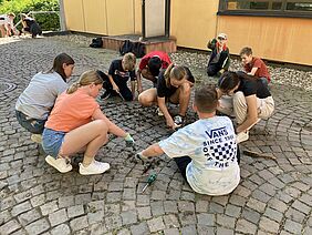Ein weiteres herausragendes Projekt war das "Brunnen-Projekt" unter Leitung von Frau Geib. Im Fokus stand die Verschönerung unser aller Lern- und Lebenswelt, insbesondere des in die Jahre gekommenen, ungenutzten Brunnens am Lehrerparkplatz. Hier war die Idee, „die Anlage und das Umfeld zu säubern, den Brunnen neu zu streichen, ihn auf beiden Ebenen mit Steinen zu befüllen und dann mit [– aus der Schulgemeinschaft gespendeten –] Sukkulenten zu bepflanzen. Die grüne Farbe greift das Grün unseres Schullogos auf. Die Steine stammen aus dem Steinbruch in Grumbach. Es handelt sich um sogenannte Kuselite [...]. Nach Planung [und] Genehmigung durch die Kreisverwaltung, Organisation und Vorarbeit konnte dann direkt am Montag mit tatkräftiger Unterstützung der Klasse 8a die Umgestaltung erfolgen. Bei idealem Wetter wurde gestrichen, geschleppt, gekehrt, gepflanzt und am Ende auch gestaunt! Parallel dazu strichen die Schülerinnen und Schüler der Jahrgangsstufe 6 unter Leitung von Frau Cassel und Frau Hess die Geländer, kratzten Fugen und rupften das Unkraut am Hang. Insgesamt sind wir [...] stolz auf das gemeinsame Ergebnis, welches auch zeigt, dass man bestehende Dinge mit einfachen Mitteln neu in Wert setzen kann - was auch dem Leitbild der Nachhaltigkeit entspricht.“