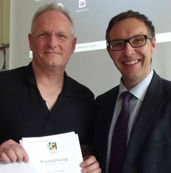 Schulleiter Stefan Weber dankt Olaf Radolak im Namen der Schulgemeinschaft ganz herzlich für seinen ehrenamtlichen Einsatz und seine tatkräftige und stets zuverlässige Unterstützung der Schule. Wir wünschen ihm weiterhin alles Gute.