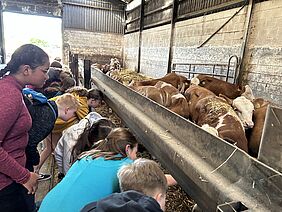 Die Schülerinnen und Schüler, die sich im Rahmen des Erdkundeunterrichts bereits intensiv mit dem Thema Landwirtschaft beschäftigt hatten, stellten viele interessante Fragen: Wozu dienen Schweine, Hühner und Kühe? Wie kommt die Milch ins Tetra-Pack, wie der Weizen ins Brot? Was unterscheidet einen Ochsen von einem Bullen? Wie sieht ein Arbeitstag auf einem Bauernhof überhaupt aus? … Auf dem Bauernhof gab es von Familie Steinhauer-Theis Antworten. Geduldig und freundlich konnten die Landwirte die Bedeutung der Viehwirtschaft und des Ackerbaus anschaulich erläutern. Dass ein Landwirt tierische oder pflanzliche Erzeugnisse, meist zur Nutzung als Nahrungsmittel, produziert und landwirtschaftliche Nutzflächen bewirtschaftet, war den Schülerinnen und Schülern bekannt. Dass dies aber auch Arbeitszeiten von täglich bis zu 14 Stunden in den Monaten der Haupternte bedeuten kann, wurde ihnen erst vor Ort bewusst.