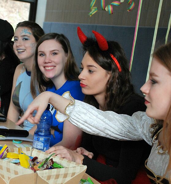 Ein weiterer Höhepunkt war schließlich die Maskenprämierung, bei der viele kreativ und fantasievoll gestaltete Kostüme den Gymnasiastinnen, die als Jury fungierten, ins Auge fielen und die deshalb den glücklichen Gewinnern Preise überreichen konnten. Pünktlich zum Ferienbeginn endete das Faschingstreiben mit einer großen Polonaise durch das gesamte Schulhaus und die letzten Cowboys und Prinzessinnen verließen fröhlich und zugleich erschöpft das Schulhaus. Helau!