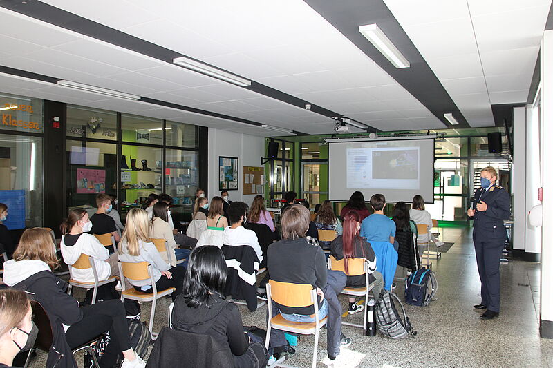 Bereits während des Vortrags, besonders aber als sich dieser seinem Ende entgegenneigte sowie in der sich anschließenden Diskussions- und Fragerunde zeigte sich an den Reaktionen und Fragen der SchülerInnen die Betroffenheit und viele Sorgen, die die hochaktuelle Thematik bei ihnen hervorruft und die in Form von offenen Fragen an die Referentin gerichtet und von dieser stets kompetent beantwortet wurden. So erläuterte sie abschließend beispielsweise diverse Szenarien, wie der Krieg in der Ukraine enden könne und welche Folgen das jeweilige Szenario für die Ukraine, Russland und Europa bzw. die Welt hätte, um den SchülerInnen zu verdeutlichen, dass der Krieg in wenigen Wochen evtl. aber erst in Jahren enden könne (sie verwies auf das Beispiel Syrien), weswegen es umso wichtiger sei, sich mit der Thematik auseinanderzusetzen. Generell band sie deshalb während ihres Vortrags immer wieder geschickt auch das Vorwissen der SchülerInnen mit ein und wies stets auf verschiedene Facetten und Bedingungen hin, die im Rahmen des Krieges in der Ukraine zu beachten seien, um die Meinungsbildung der SchülerInnen anzuregen. So stand zu Beginn des Vortrags beispielsweise die Frage, woher die SchülerInnen ihre Informationen zum Konflikt beziehen würden („Das erste Opfer des Krieges ist die Wahrheit“), verbunden mit der Aufforderung, die Quellen stets zu hinterfragen und zu prüfen. Hiernach ging sie Schritt für Schritt auf zentrale Themenfelder ein, die zum Verständnis des Krieges sowie des tagesaktuellen Geschehens von zentraler Bedeutung sind, beginnend mit Russland und der Rolle Putins. Sie legte dar, dass Putins Ziel, ein starker russischer Staat, lediglich unter der Bedingung eines Wirtschaftswachstums sowie der Unterbindung von Kritik(ern) zu erreichen sei, weswegen auch eine starke Anbindung an China erfolge und untermauerte dies mit Statistiken sowie Erläuterungen zur wirtschaftlichen und militärischen Entwicklung Russlands, bevor sie sich der Ukraine und Präsident Selenskyj widmete. Auch hier betonte u. a. sie die wirtschaftliche Rolle der Ukraine (z. B. als „Kornkammer Europas“), verwies aber insbesondere auf die global-ökonomischen Folgen des Krieges, indem sie auf die Konsequenzen für den afrikanischen Kontinent einging. In der Folge zeigte sie die politische Entwicklung der Ukraine (beginnend mit den Euro-Maidan-Protesten) sowie auch die militärische auf, um im Anschluss fundiert den Kriegsverlauf sowie die jeweiligen Hintergründe (Taktik, Kampfmoral etc.) zu erläutern. Im Anschluss wandte sie den Blick auf die Rolle der NATO, EU, UN sowie Deutschlands und griff hier viele Fragen der SchülerInnen auf, die sich um den möglichen Bündnisfall nach Artikel 5 des NATO-Vertrags, die Sanktionen der EU, die Waffenlieferungen Deutschlands, die Abhängigkeit vom russischen Gas oder die 100 Milliarden Sondervermögen drehten, die in die Bundeswehr investiert werden sollen.