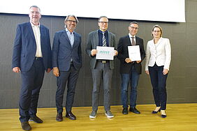 Das Veldenz Gymnasium erwarb bereits vor 2 Jahren die Auszeichnung „MINT freundliche Schule“ und wurde in Mainz erneut für ihr Engagement in diesem Bereich geehrt. Zusätzlich wurde das Gymnasium jetzt erstmalig als „Digitale Schule“ ausgezeichnet, wodurch die Zukunftsorientierung der Schule deutlich unterstrichen wurde. Unser Bild zeigt Herrn Harald Fisch (MINT Zunkunft e.V.), Herrn Thomas Michel (Diensleistungsgesellschaft für Informatik), Herrn StR Sebastian Becker, Herrn OStD Stefan Weber und die Bildungsministerin Frau Dr. Stefanie Hubig bei der Verleihung der Labels für das Veldenz Gymnasium.